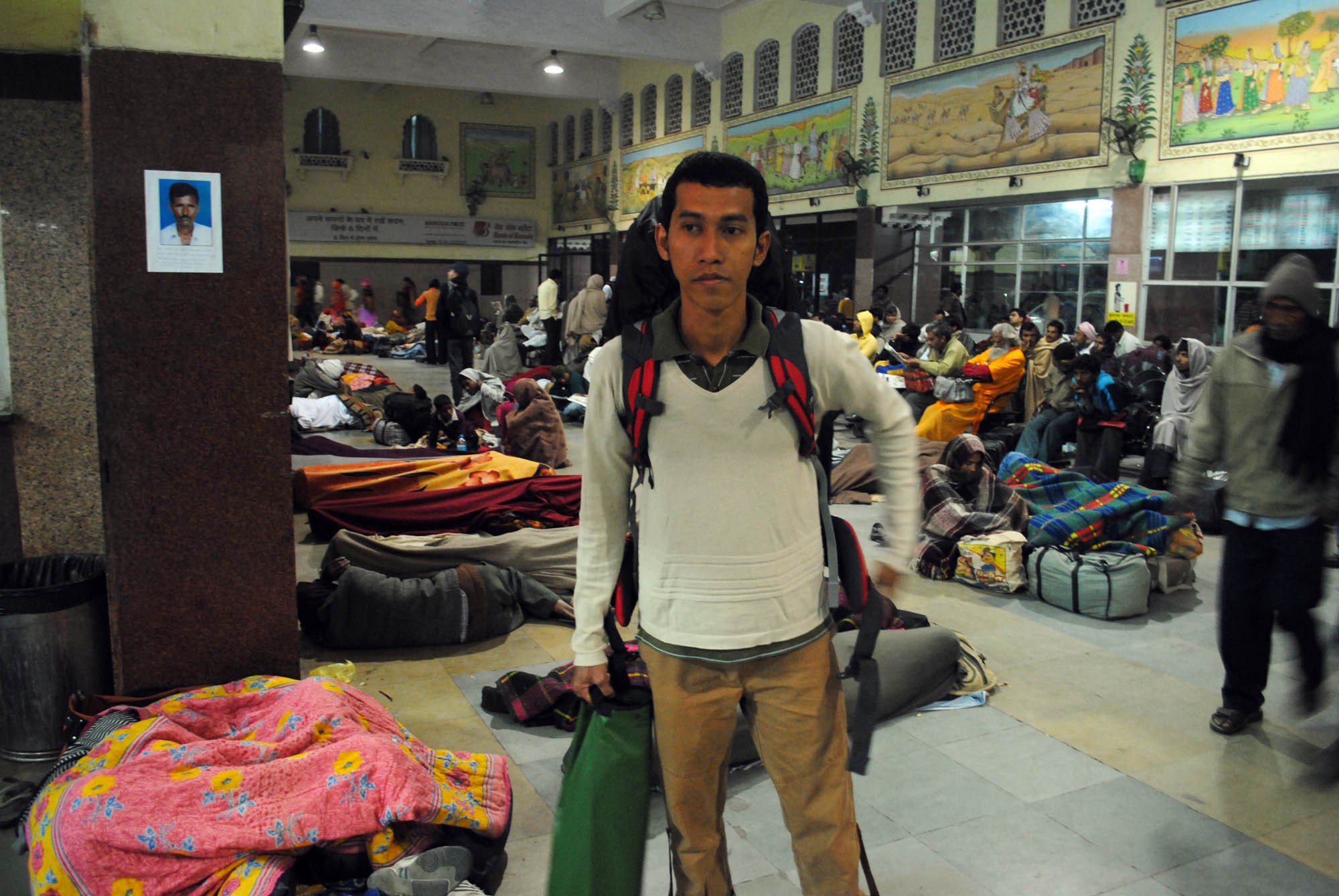 Shakir at the station. You can see people sleeping on the floor. Photo by Syahid Ishak